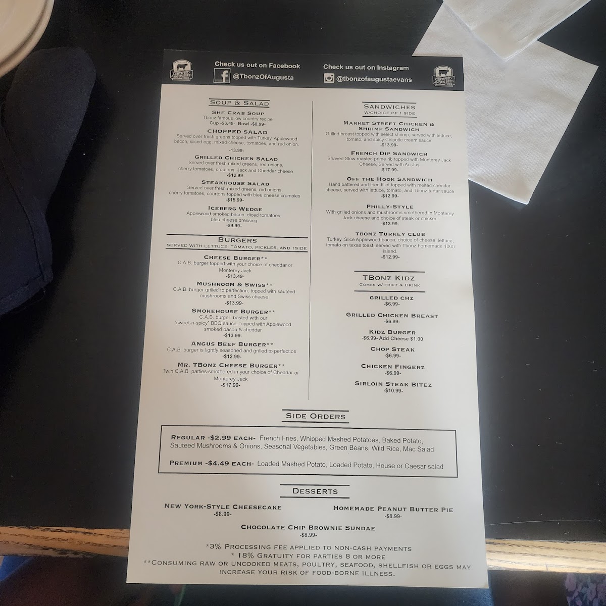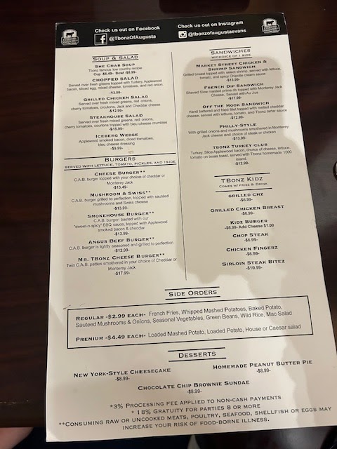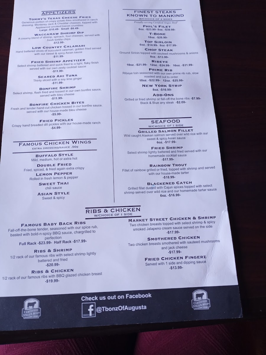 At Tbonz Steakhouse of Augusta, every meal feels like a celebration. The Tbonz Steakhouse of Augusta Menu offers a variety of mouth-watering dishes, from perfectly grilled steaks to savory sides that complement every bite. You’ll find classic favorites like the tender ribeye, juicy sirloin, and a variety of delicious sauces to elevate your steak experience. Whether you’re in the mood for a fresh salad or a hearty baked potato, there’s something for everyone to enjoy. The warm, inviting atmosphere makes it the perfect spot to relax with friends and family while indulging in flavorful meals. From the first bite to the last, the menu promises a truly satisfying dining experience.